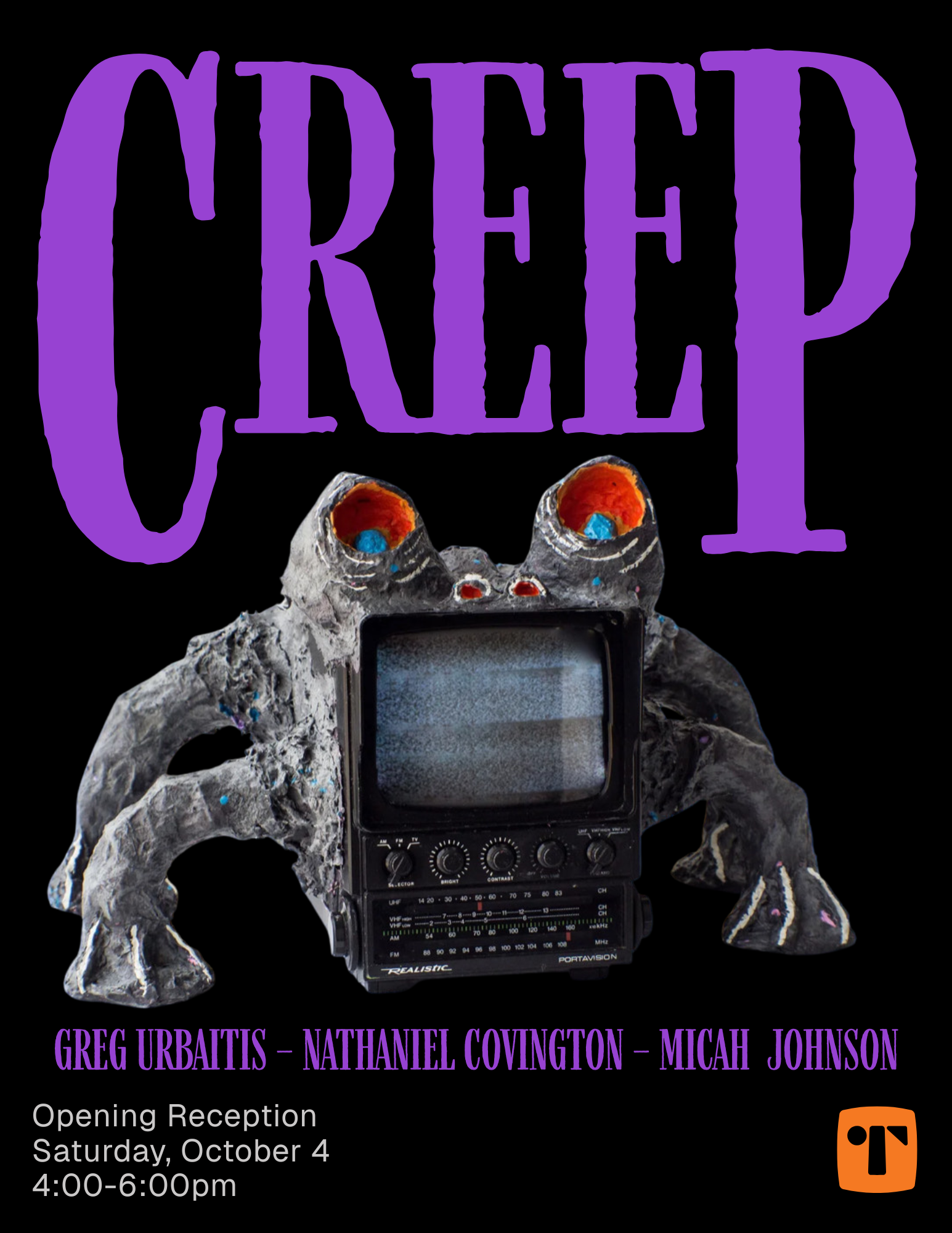 CREEP is a group show featuring some of Nashville’s spookiest artists: Greg Urbaitis, Nathaniel Covington, and Micah Johnson. This collection consists of wacky paper mâché creatures, pop-culture collages, and monster heads inspired by Depression Era toys.