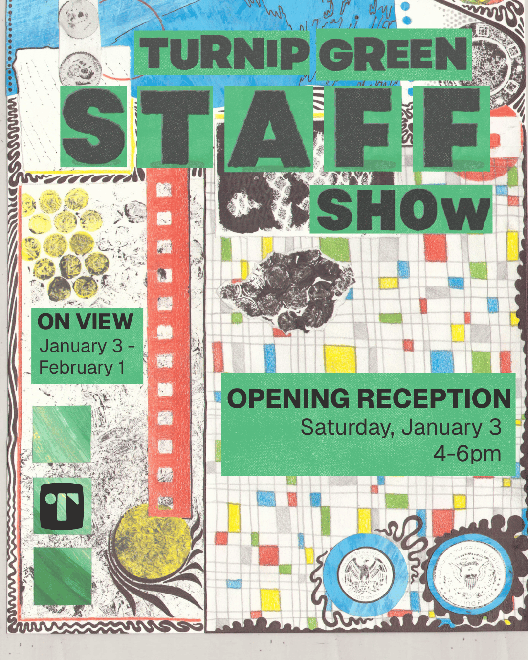 Join us this month to explore a diverse collection of artwork created by Turnip Green’s staff, board members, and teaching artists. This exhibit features unique pieces made from a variety of reuse materials including paper, beads, wood, fabric, glass, seashells, and other repurposed materials—all transformed into works of art!