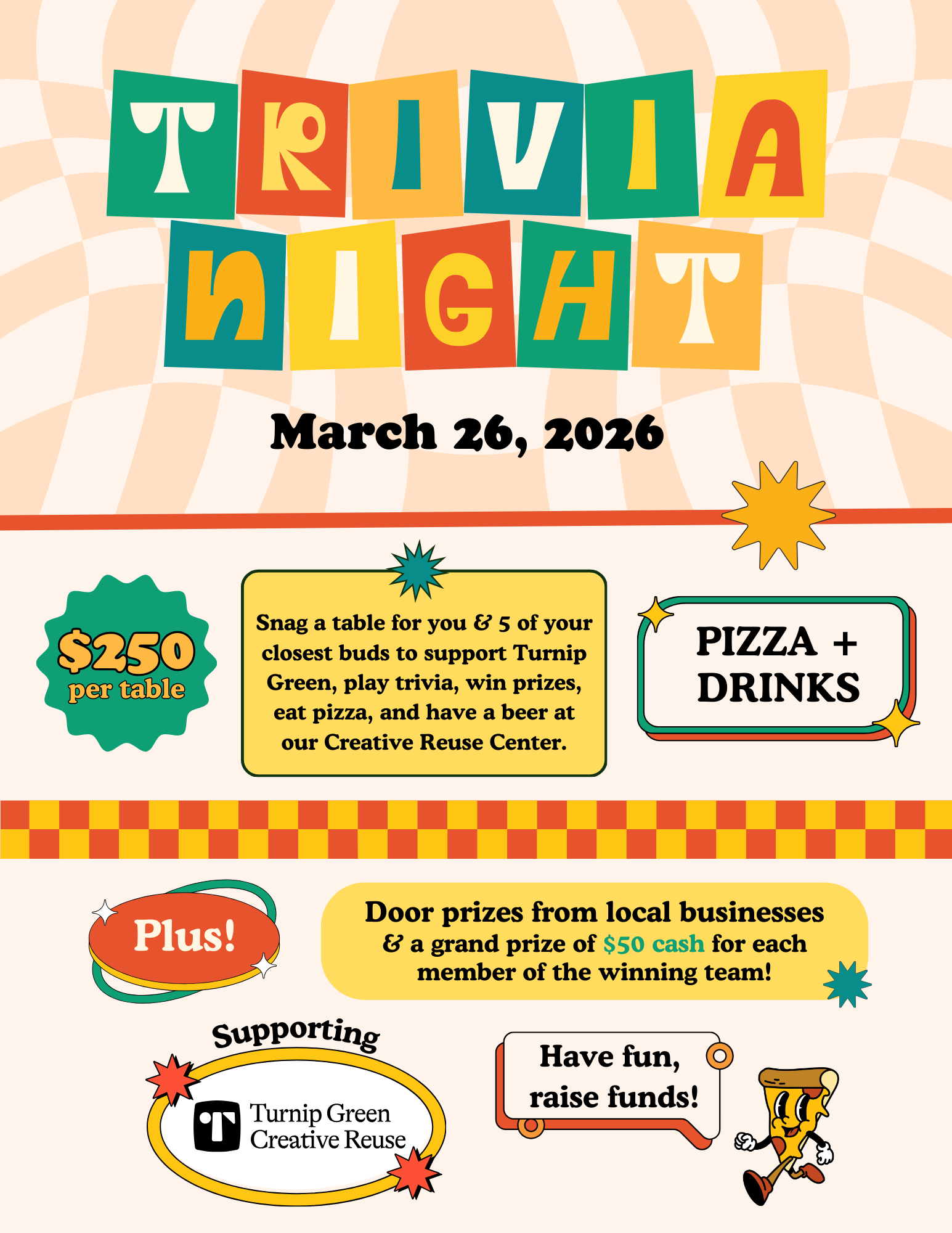 Turnip Green Creative Reuse is a 501(c)(3) non-profit that provides sustainable resources, accessible materials, and arts programming to the community. By financially supporting Turnip Green, you help to directly fund staff and program costs, allowing us to sustain our mission year round.